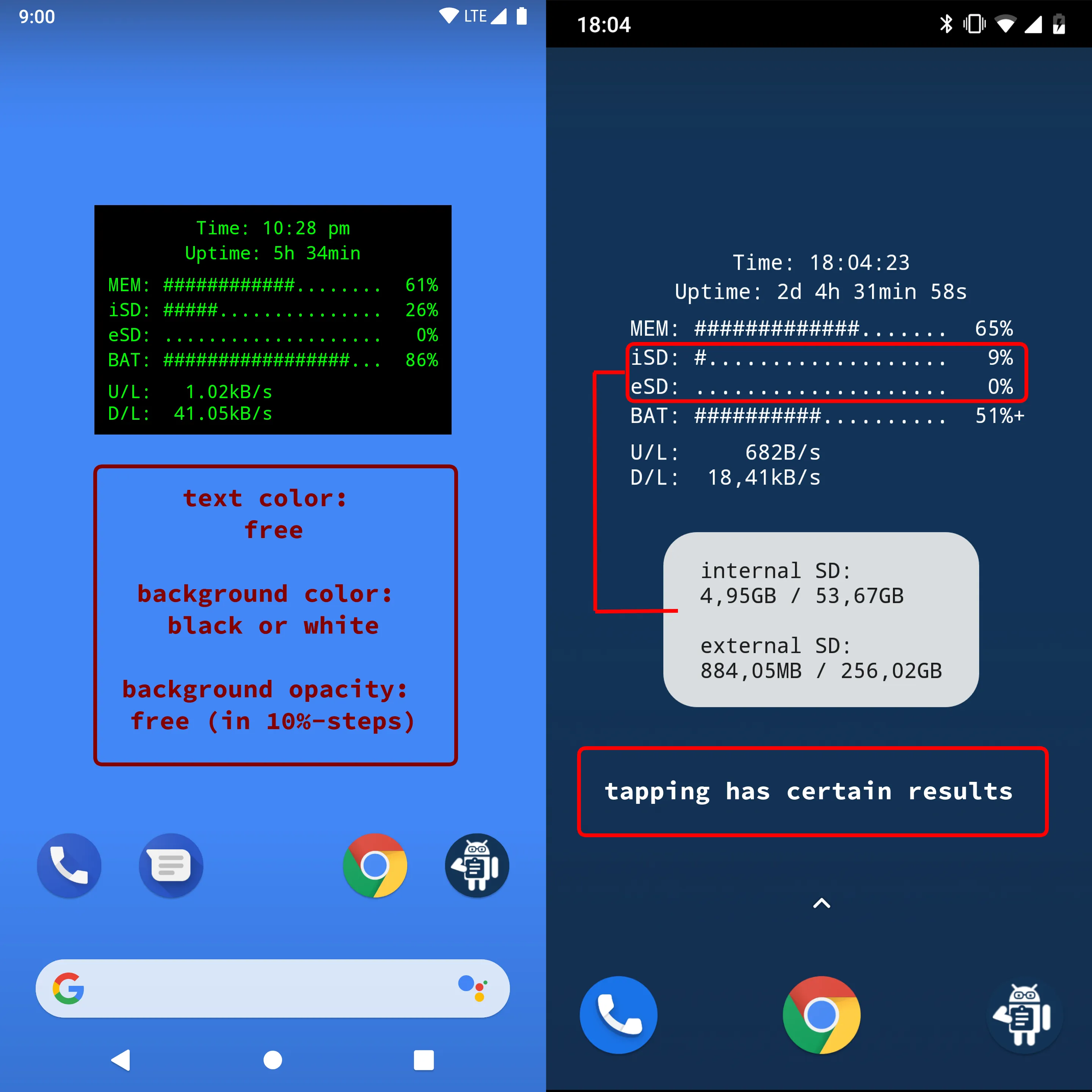 Tapping (most of) the widgets will have certain results, like showing the exact values of the memory or SD-card usage as toast message