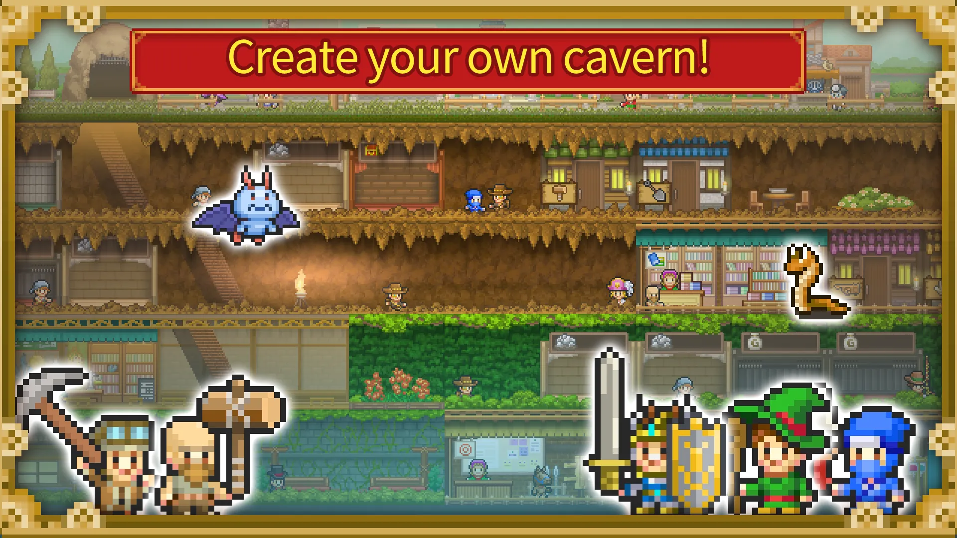 Your adventurers will face all kinds of challenges in the underground, but there’s no obstacle you can’t deal with if you know how. Place torches to light up the darkness, build bridges to traverse gorges, and use explosives to clear away large rocks!