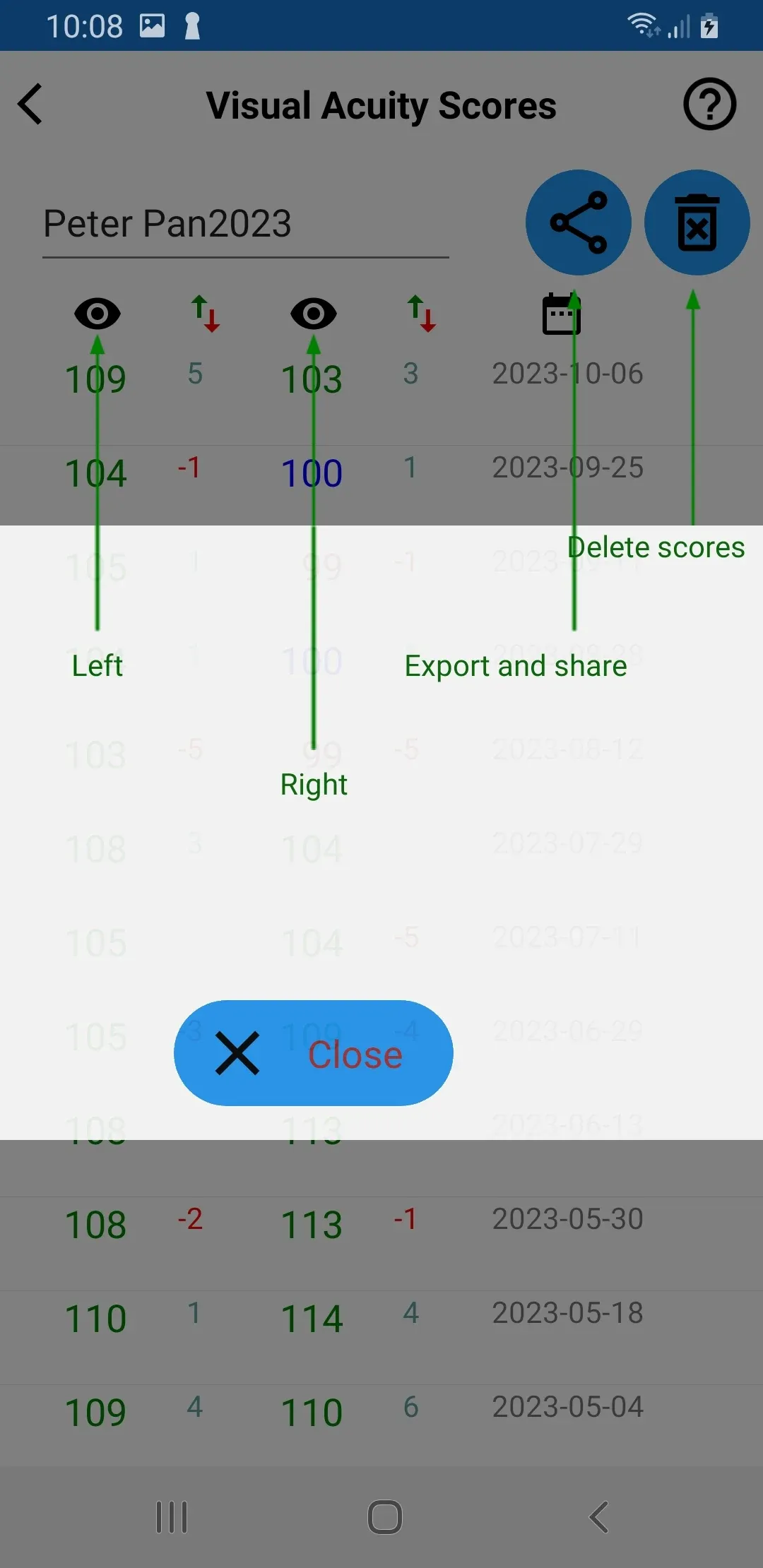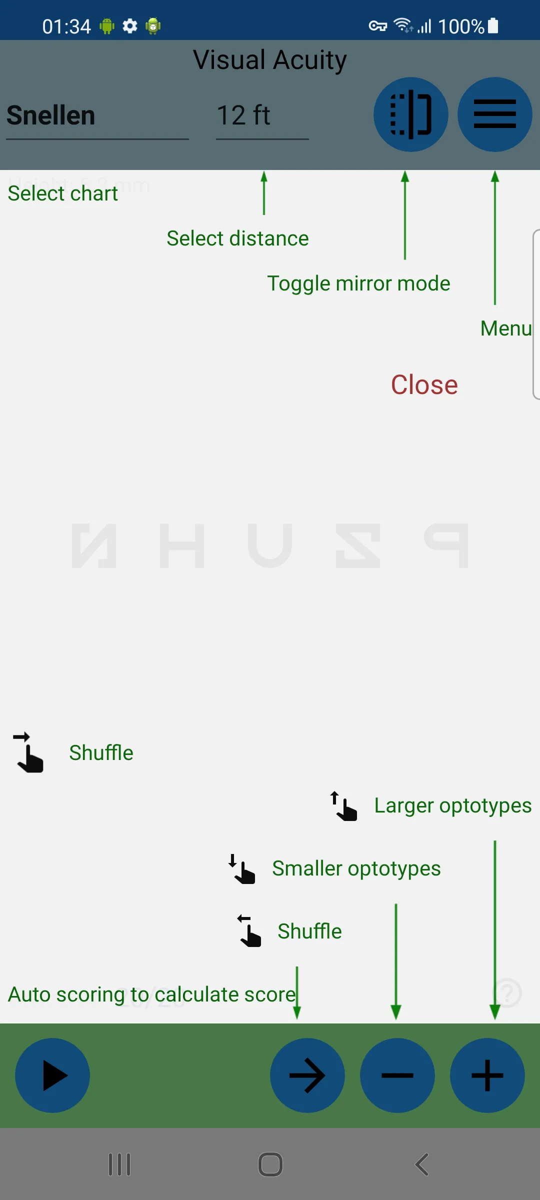 2. Auto scoring – Swipe gestures indicate correct or incorrect readings, and the app calculates scores. Enable “Record Scores” in settings to track visual acuity progression, with support for multiple test subjects.