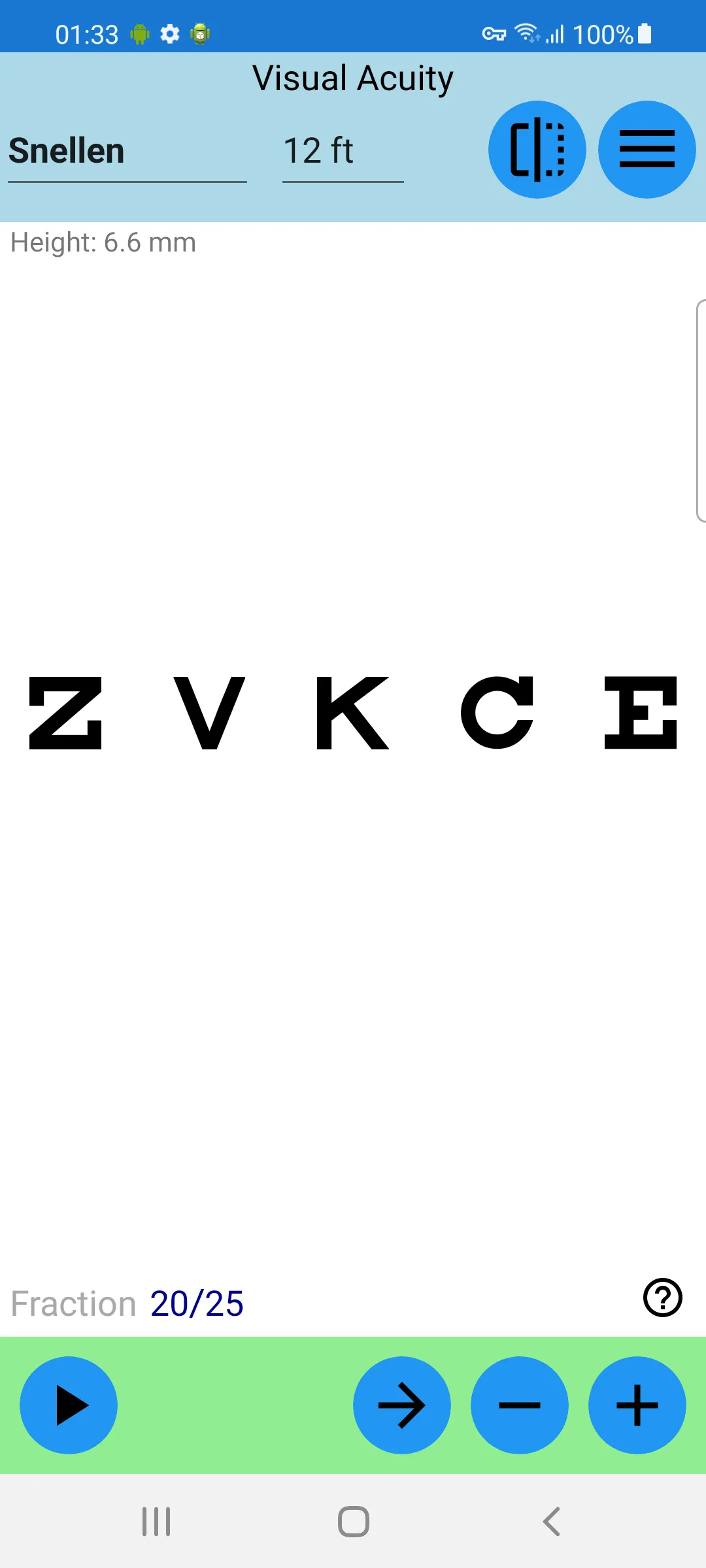 2. Self-diagnosis with a mirror – Stand in front of a mirror using the app in mirror mode with an eye patch covering one eye. The actual test distance is twice the distance between you and the mirror.