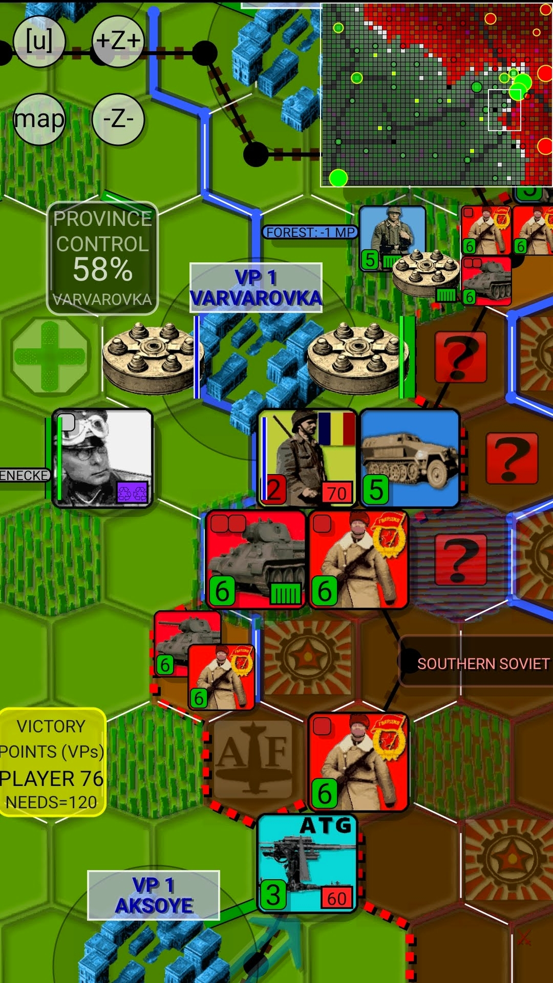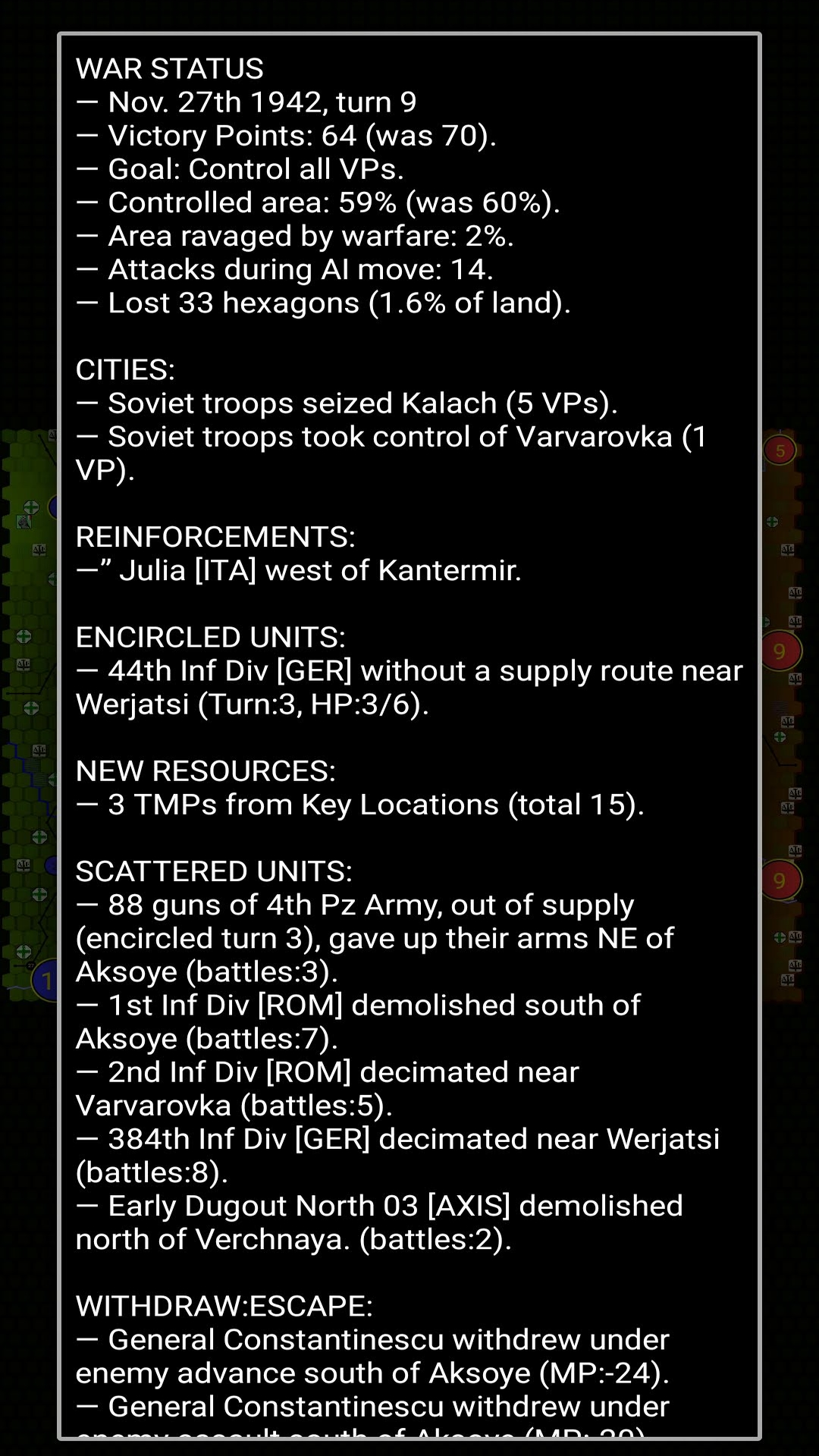 You are in command of the Axis forces when the Red Army launches Operation Uranus – The encirclement of the German 6th Army located in the Stalingrad Area. The object of the game is to hold the collapsing front line and gather enough troops for a counter-strike to free the 6th Army, and then using the freed forces control the entire area of the map. Failing that, your score will be the number of turns you managed to hold on before collapsing to zero VPs.
