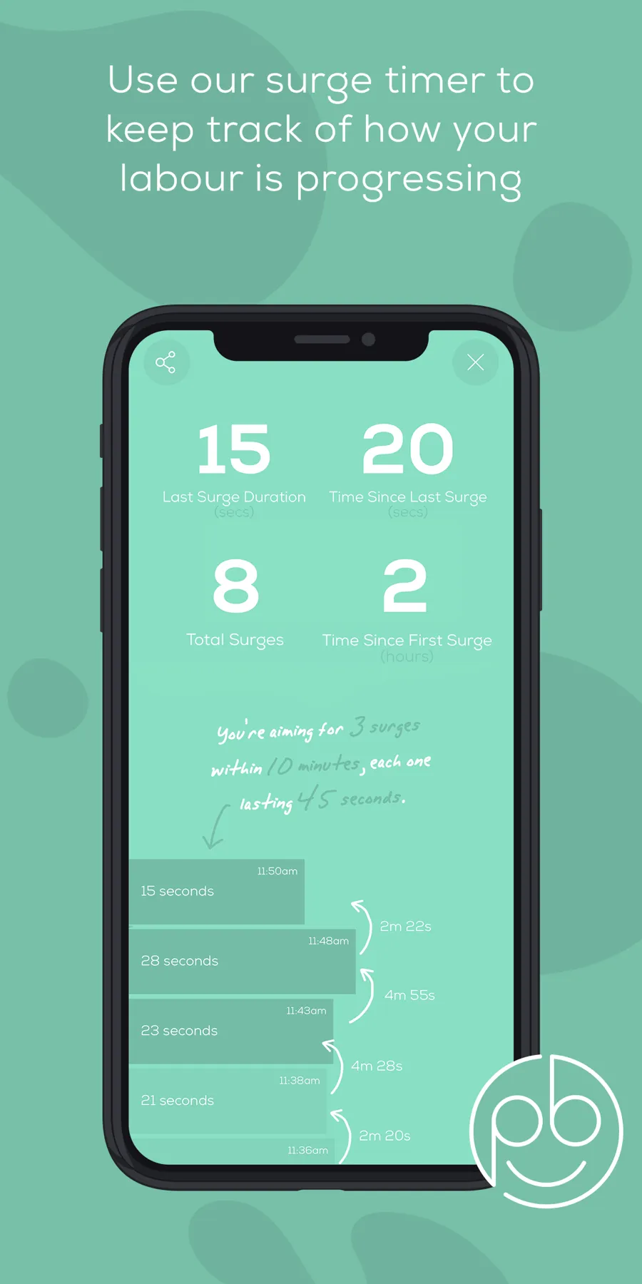 • A detailed log of your surges over time, so you can track your progress through labour
