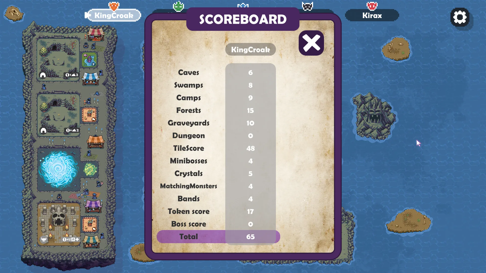 Swamps get Power points for being adjacent to coasts and other Swamps. Graveyards give a big bonus to whoever collects the most, while Forests increase in Power as you collect more.