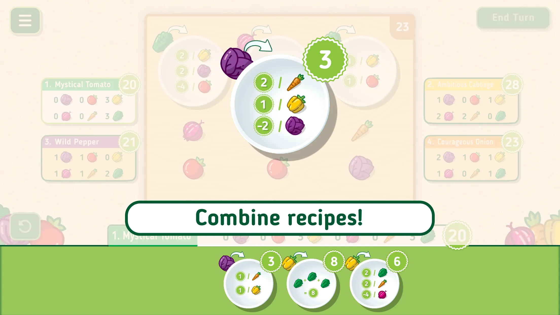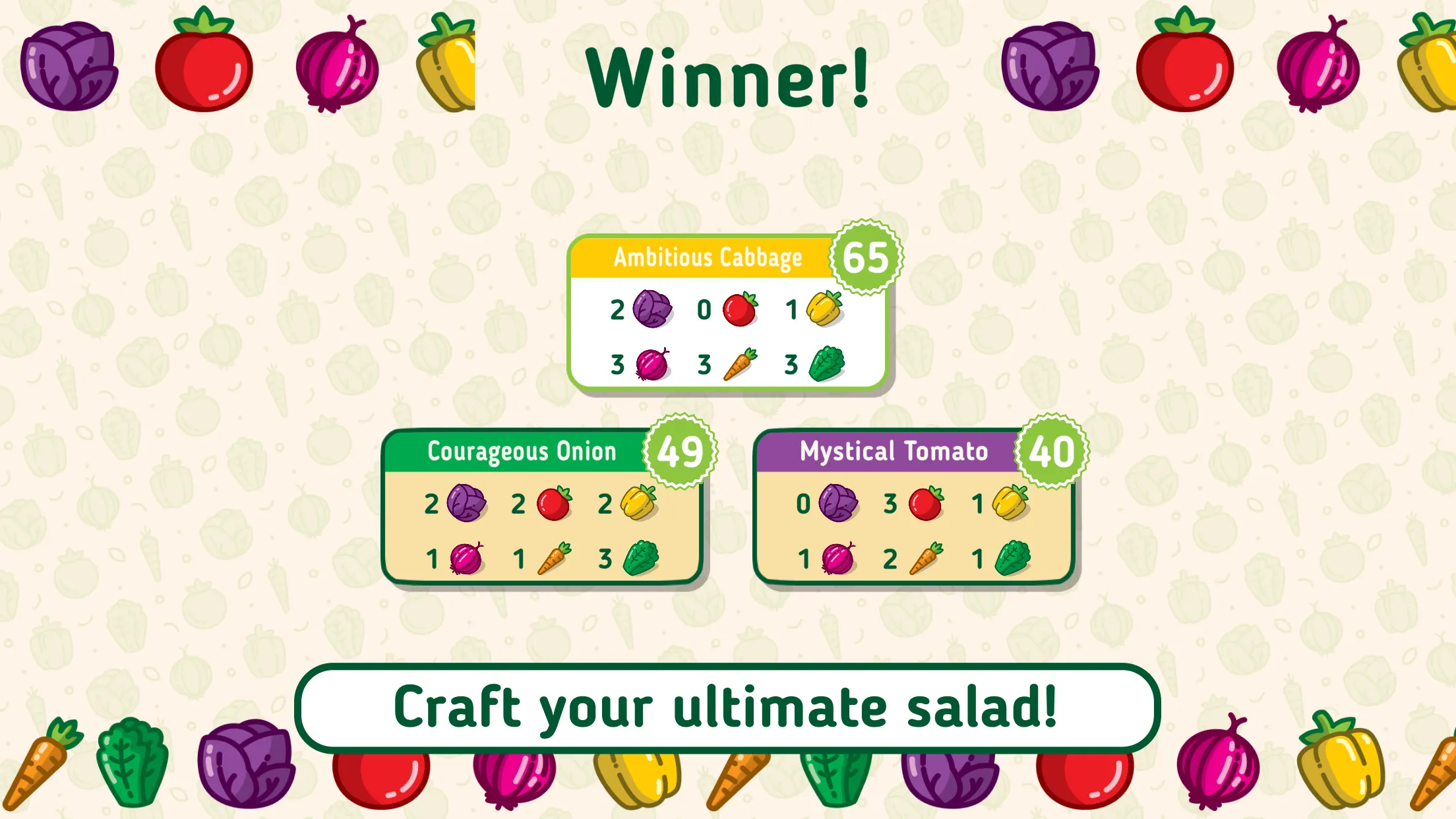 On each turn, dive into the market and choose between 2 fresh veggies or a tempting recipe. The market refreshes, and your opponents join the veggie hunt. Multiple recipes can make use of the same veggie so strategize to collect the perfect combo. The game wraps up when all veggies and recipes are gathered, and the crowned champion is the one with the most points. Let the salad showdown begin!