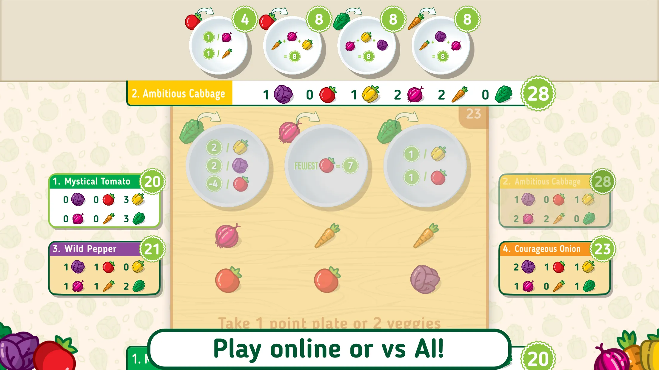 In the world of Point Salad, veggies and recipes are your key ingredients. Every recipe comes with its own scoring rules, so whether you’re stockpiling tomatoes or aiming for a well-balanced mix, it’s all about the recipes you snag. It’s a lively, family-friendly game that’s now available for fun battles against friends and family online, or even against salad-lovin’ AI opponents!