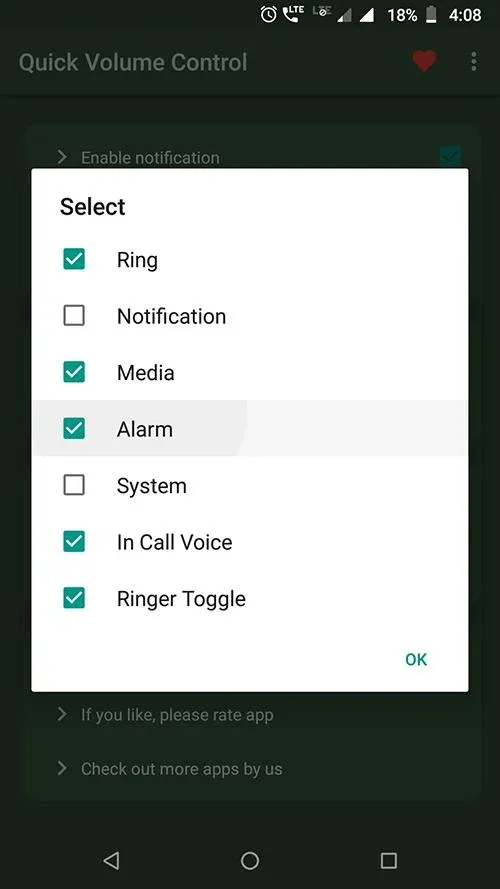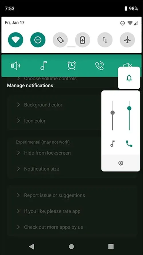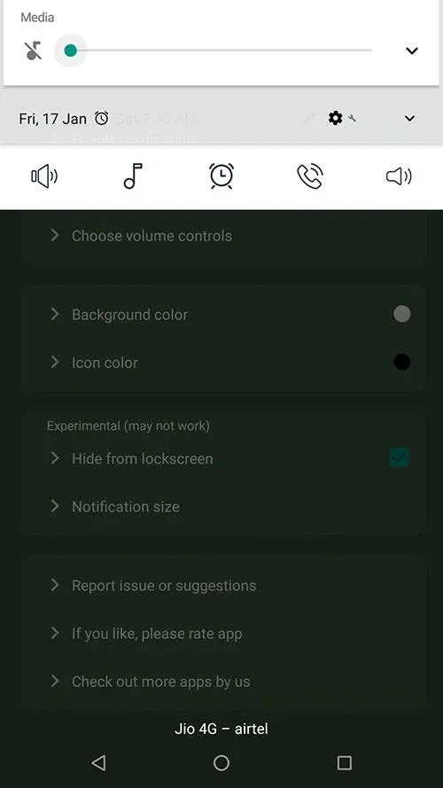 It provides maximum customisation options with clean simple UI. app allows notification toggles for volume sliders: Ring, Notification, Alarm, Music, In call and system(dial tone).