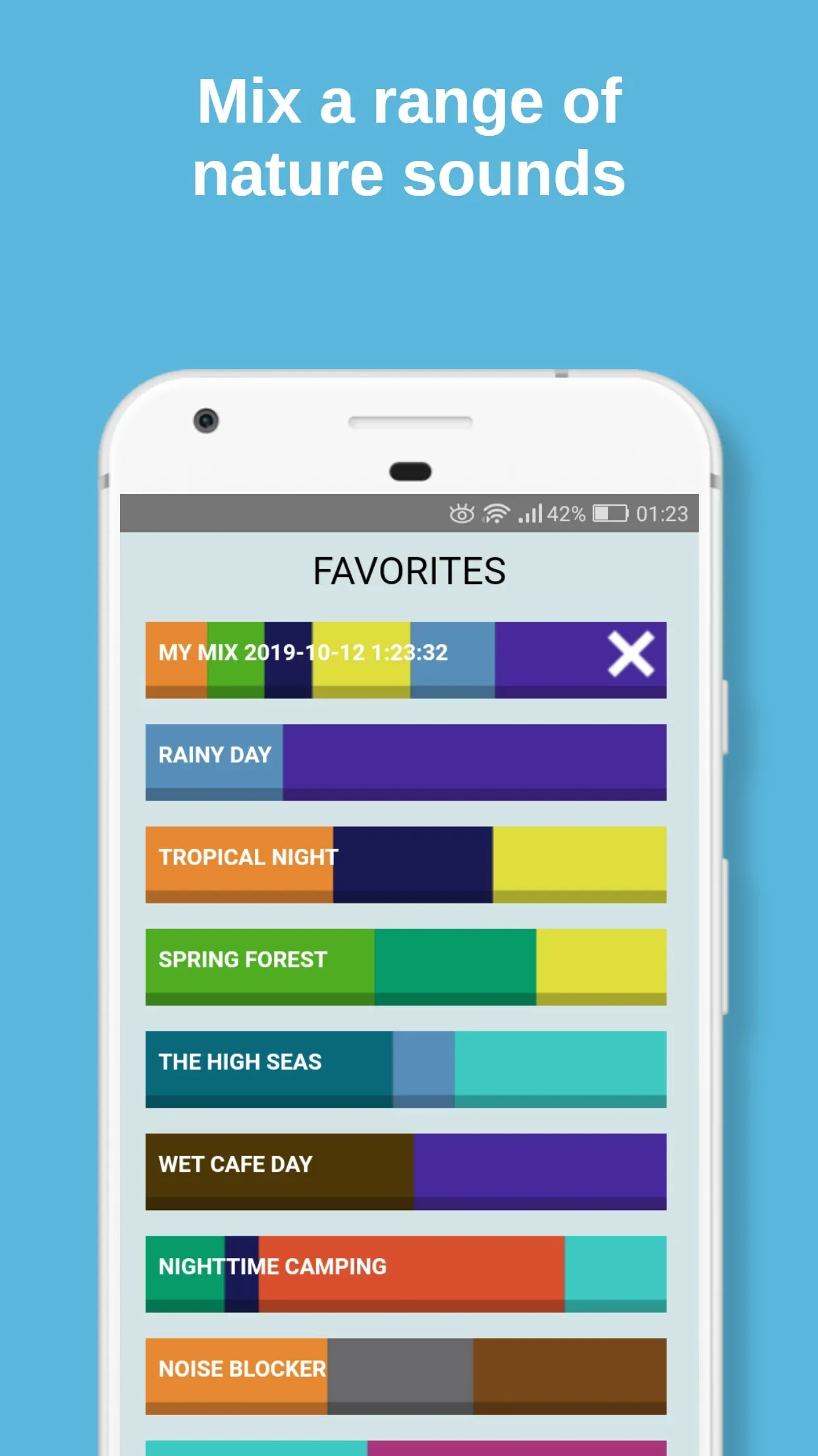 Relax and sleep better with a variety of relaxing sounds, which you can mix to your liking. From rain and nature sounds, to cafe ambiance and white noise. Relaxify is a small download with low battery usage and 14 high quality 3D stereo sounds, from rain and forest sounds, to ocean waves and womb sounds.
