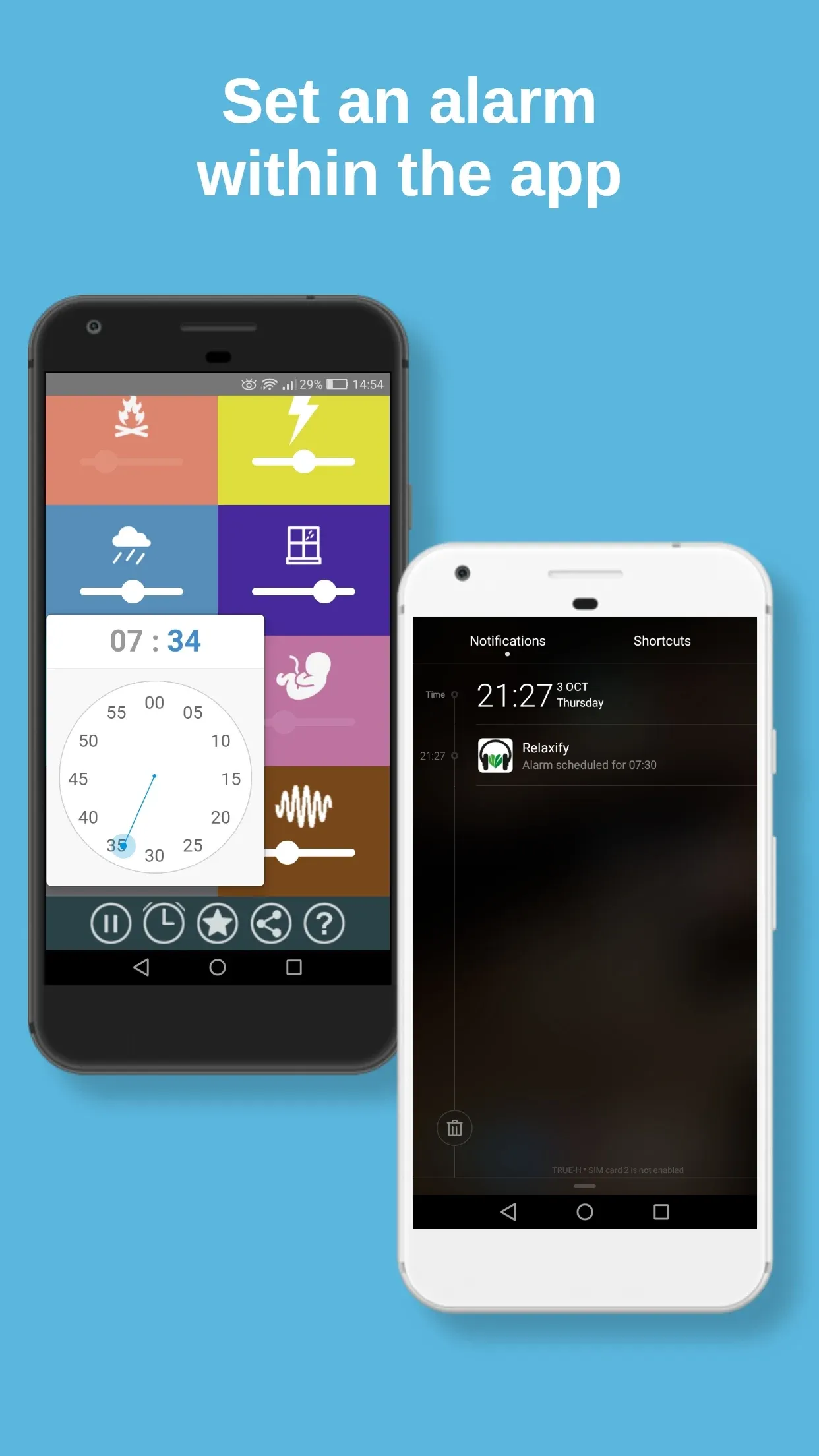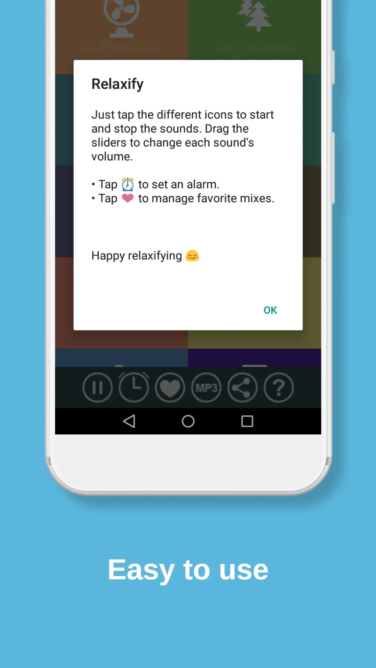 The sounds all have different lengths, so mixing them means no repeating loops! Relaxify has a built-in alarm and you can even load an MP3 track to loop in the background – perfect for mixing music with rain sounds!