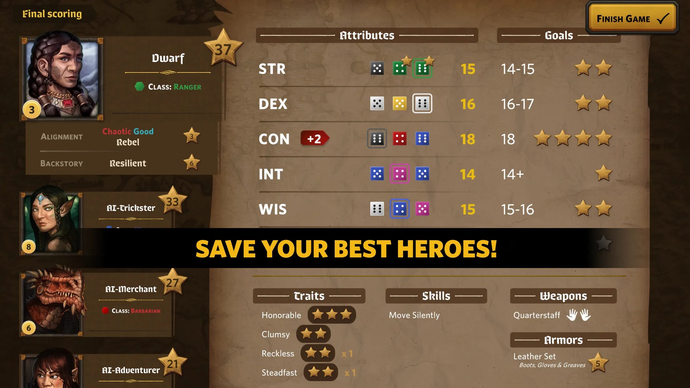 At the beginning of the game, each player is assigned a random RPG class, alignment and a backstory. Through a series of puzzle-like dice manipulations, a player optimizes their character’s attributes and attempts to maximize their alignment and backstory points. Earned gold is used to purchase various skills, traits, weapons and armor in the market phase of each turn. The game ends with a fully created character sheet of an RPG character and the player whose character has the most reputation points wins the game. The best character sheets are stored in the Hall of Heroes.