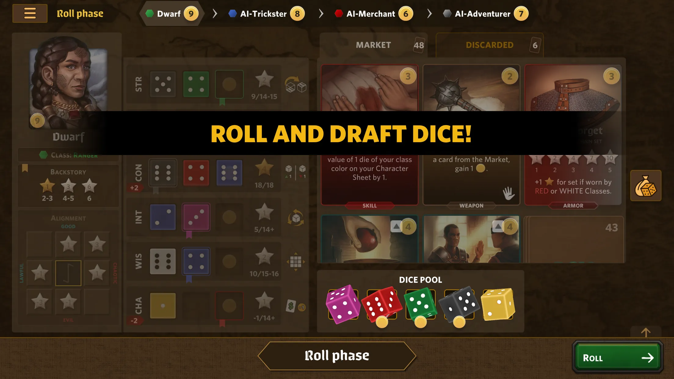 Roll Player is a digital adaptation of a dice manipulation, strategy board game where you will compete to create the greatest fantasy character in the role-playing world!