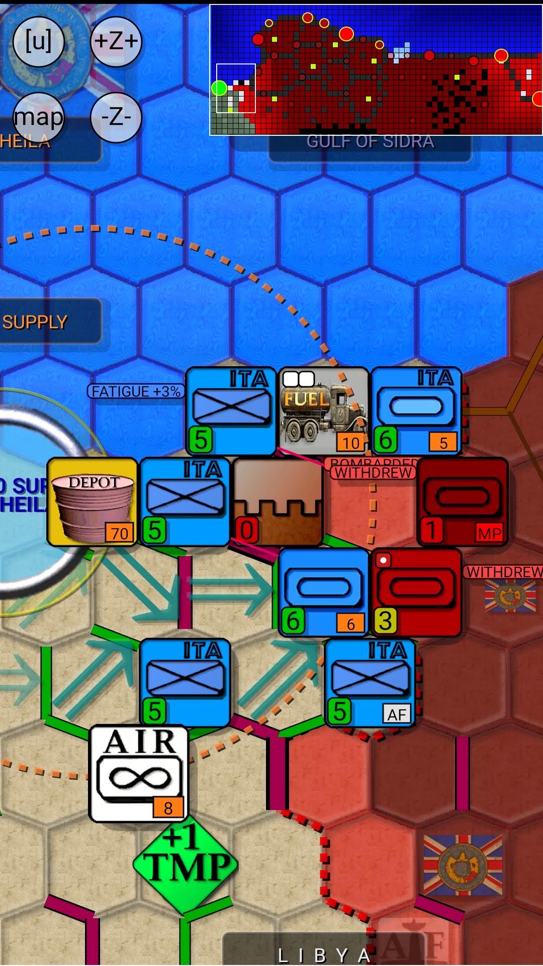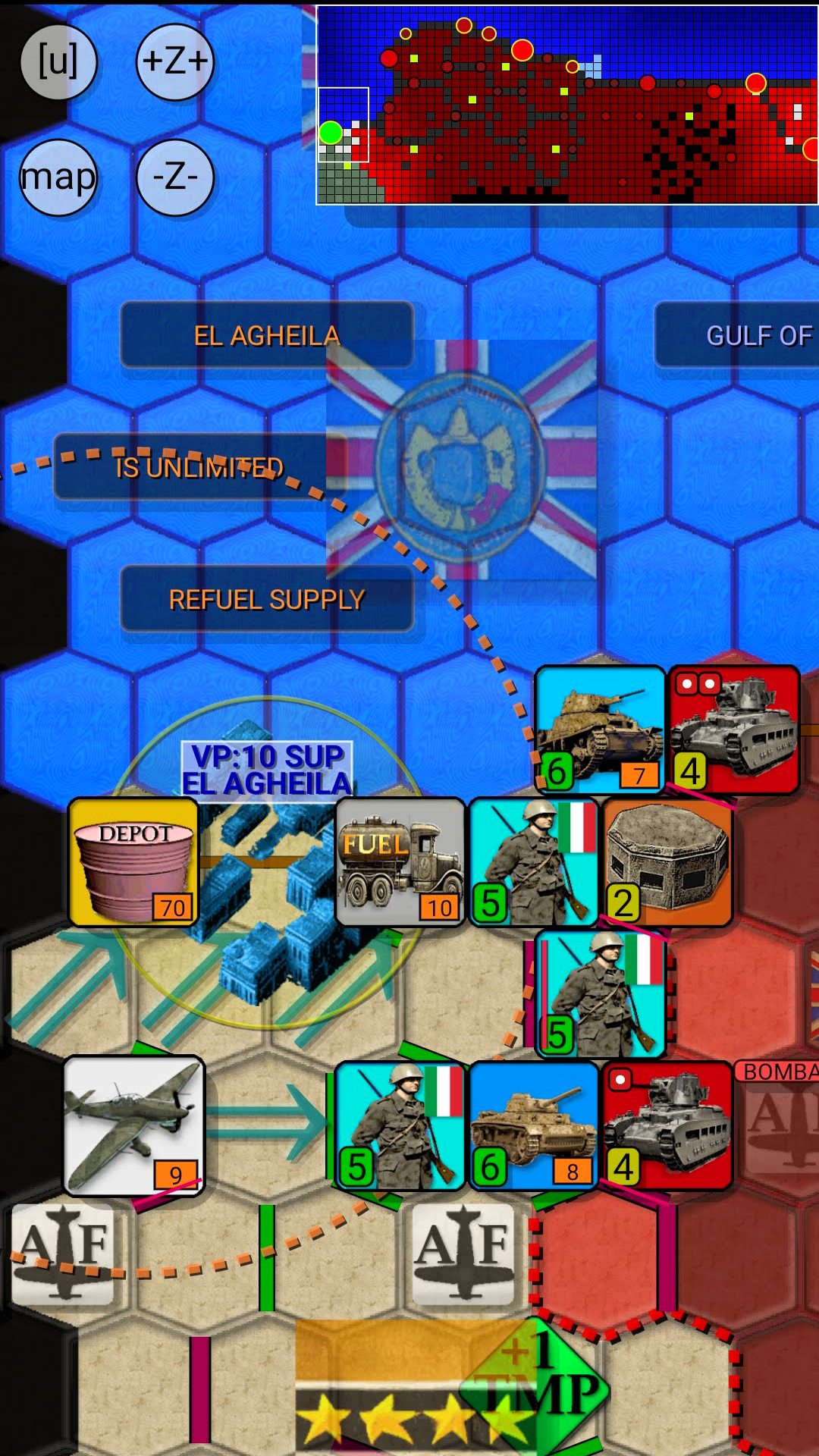 Supply Rules: To keep your armored and motorized divisions on the move you must use Fuel Trucks to transport fuel from Fuel Depots to front line units. Fuel Depots can be refueled only from El Agheila (unlimited amount) or Tobruk (limited amount). Meanwhile only El Agheila and Benghazi provide food supply, so units must have a route to either of these cities after the British forces have moved. Those who enjoyed old-school physical tabletop battles will appreciate this style.