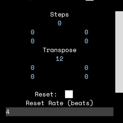 The arpeggiator receives notes from the sequencer and keyboard. Its rate is controlled by both synced time and ms that are added together. It has variable steps, step transpose, and gate. The steps and timing can be reset periodically with the optional arp reset. There is optional diatonic scale locking as well, allowing you to select a root note and scale from major, Dorian, Phrygian, Lydian, Mixolydian, Minor, and Locrian.